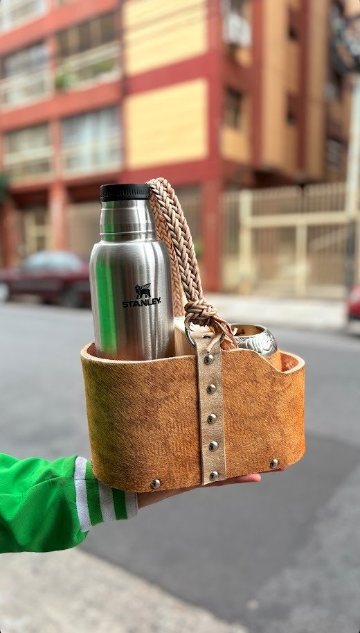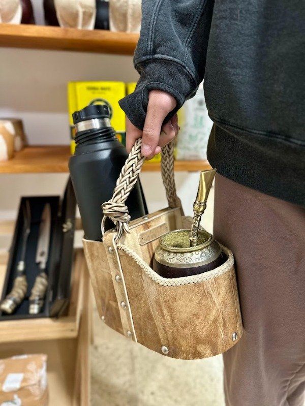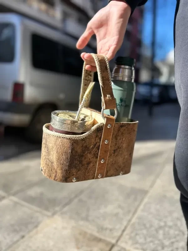Canasta criolla trabajada con cuero crudo y costura clásica en tiento de chivo de 2 mm.